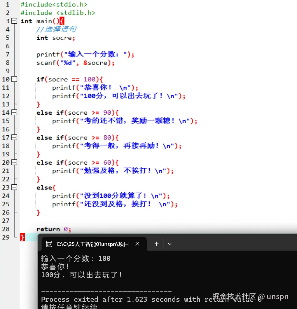 如果分数socre小于100,则跳过if语句中的输出内容,直接输出下一语句