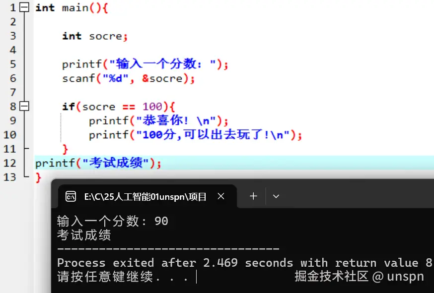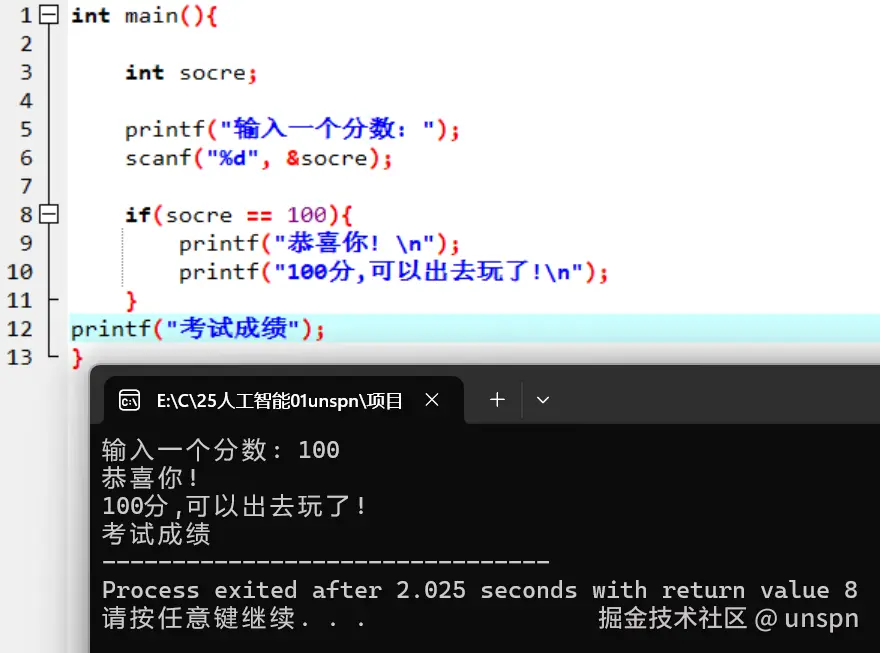 如果分数socre为100,则先输出"恭喜"再输出"考试成绩"
