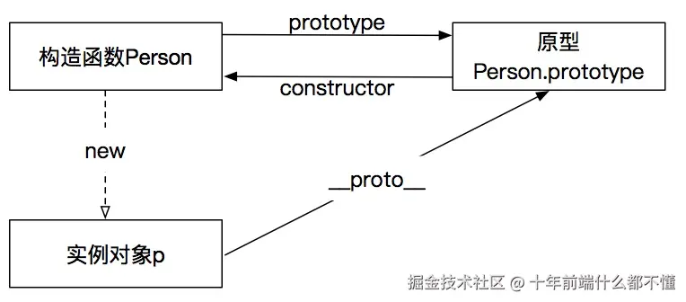 这个图描述了构造函数,实例对象和原型三者之间的关系,是原型链的基础:
