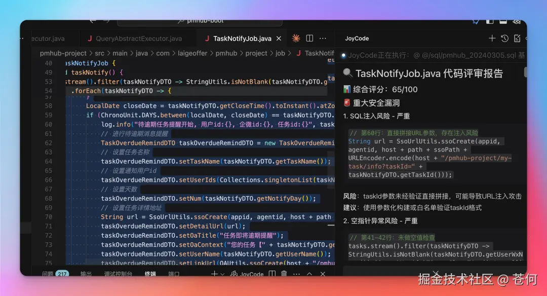JoyCode 会给出一份评审报告,并列出改进建议和优先级排序。