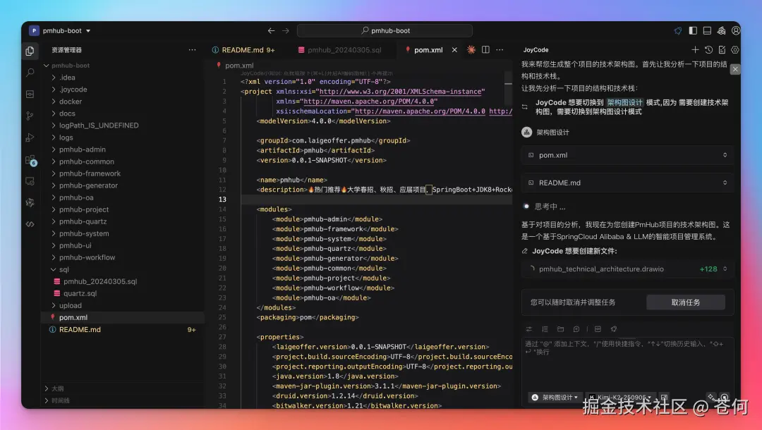 可以看到 JoyCode 自动切换到架构图设计模式,然后上来就先分析了项目中的 pom. xml 依赖文件及 Readme 文件,以及对整个项目理解就开始吭哧吭哧自动调用 draw. io 帮画项目架构图了。