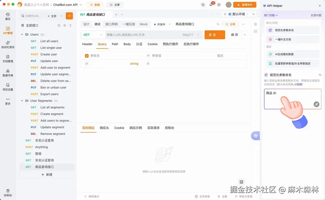 现在我们要求所有接口参数命名必须通过AI生成:输入"用户注册时的邮箱地址",系统自动生成userEmail并附带描述"格式为xxx@xxx.xxx,长度不超过50字符";输入"订单创建时间",生成orderCreateTime并标注"ISO 8601格式,如2025-06-25T12:00:00Z"。