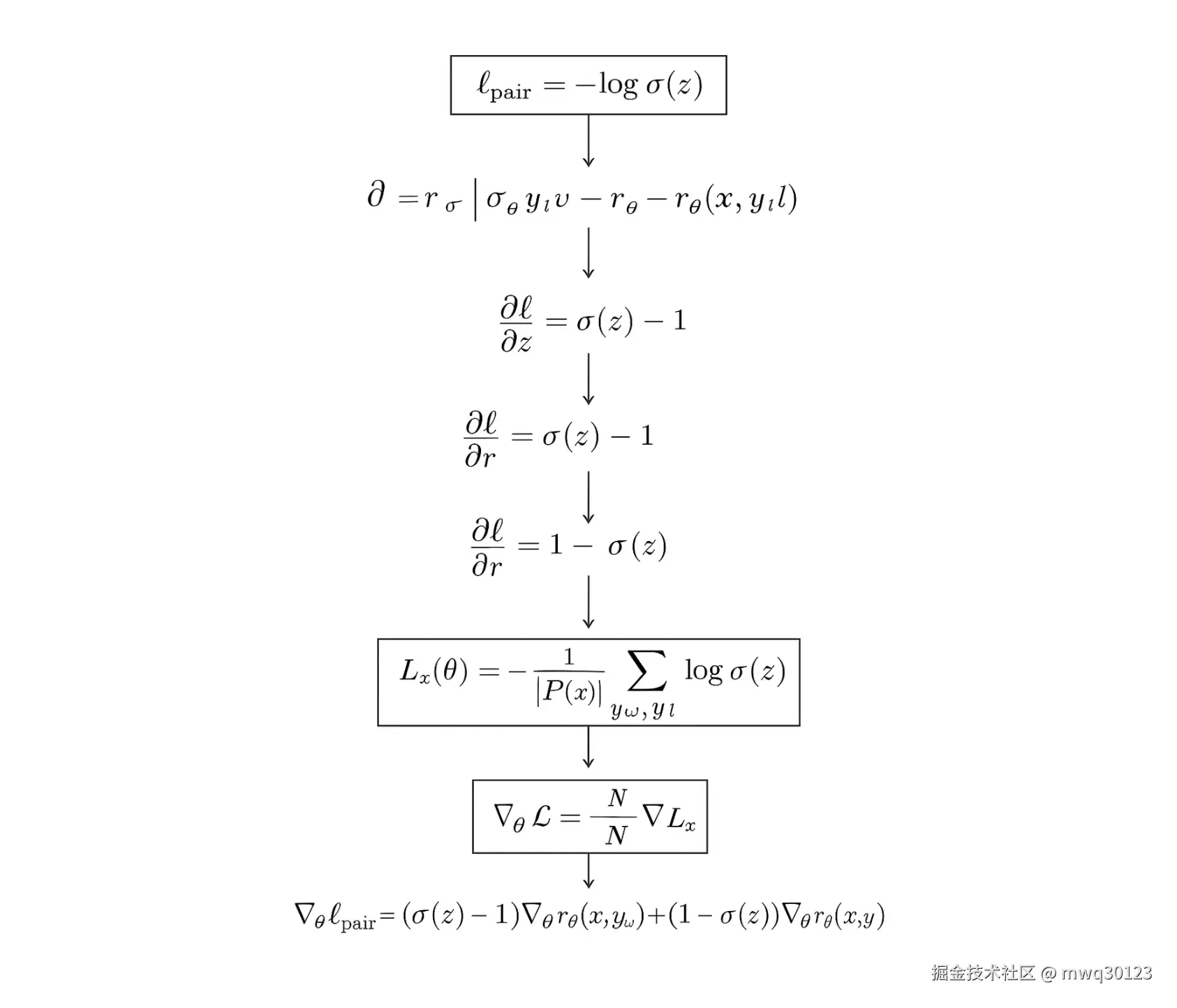 <math xmlns="http://www.w3.org/1998/Math/MathML" display="block"> ∇ θ L pair = ( ∂ L pair ∂ s ⋅ ∂ s ∂ r w ) ⋅ ∇ θ r w + ( ∂ L pair ∂ s ⋅ ∂ s ∂ r l ) ⋅ ∇ θ r l \nabla_\theta L_{\text{pair}} = \left( \frac{\partial L_{\text{pair}}}{\partial s} \cdot \frac{\partial s}{\partial r_w} \right) \cdot \nabla_\theta r_w + \left( \frac{\partial L_{\text{pair}}}{\partial s} \cdot \frac{\partial s}{\partial r_l} \right) \cdot \nabla_\theta r_l </math>∇θLpair=(∂s∂Lpair⋅∂rw∂s)⋅∇θrw+(∂s∂Lpair⋅∂rl∂s)⋅∇θrl