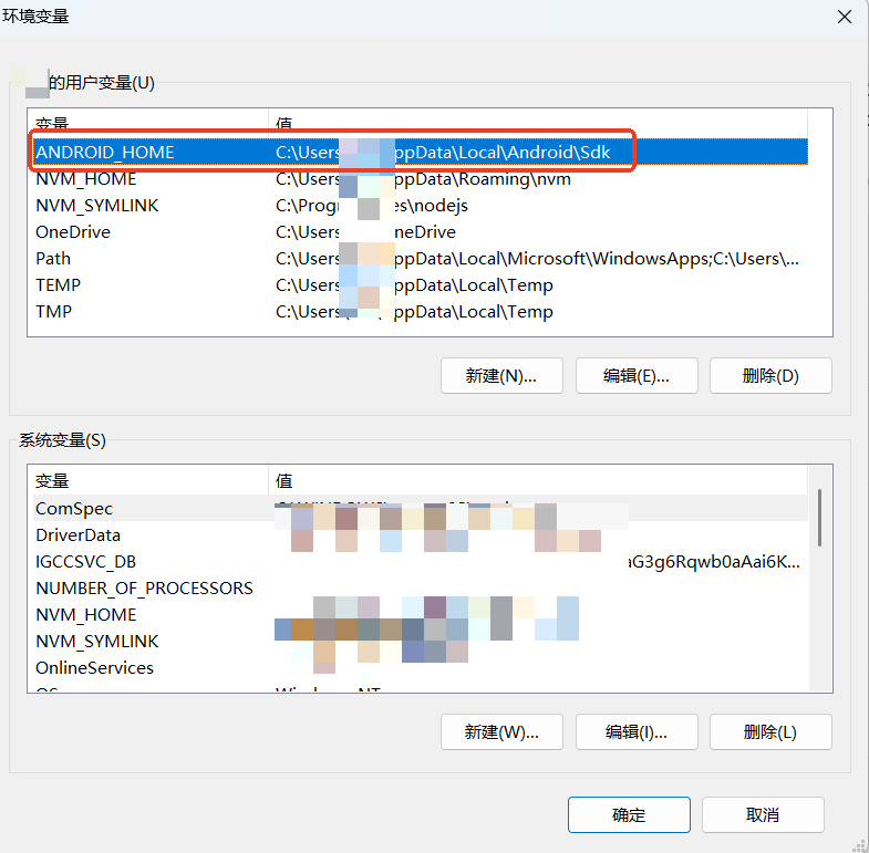 在电脑的环境变量中添加一个 ANDROID_HOME 变量,用户变量和系统变量都行,值为SDK所在的目录。比如我的是在用户变量里添加的: