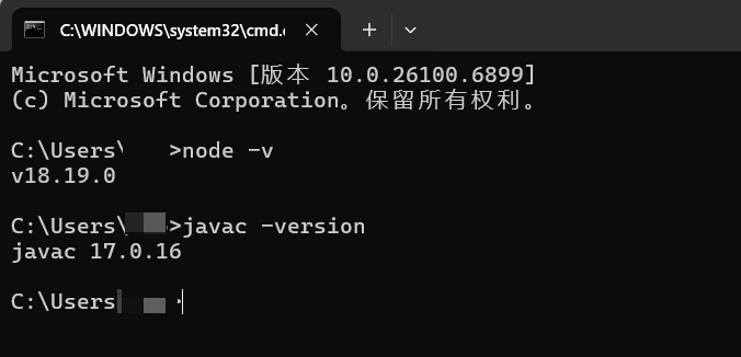 Node 18+ 和JDK 17的具体安装步骤就不在这里详细说了。安装完成后可以在命令提示符中输入 node -v 和 javac -version 来查看当前安装的Node和JDK版本。