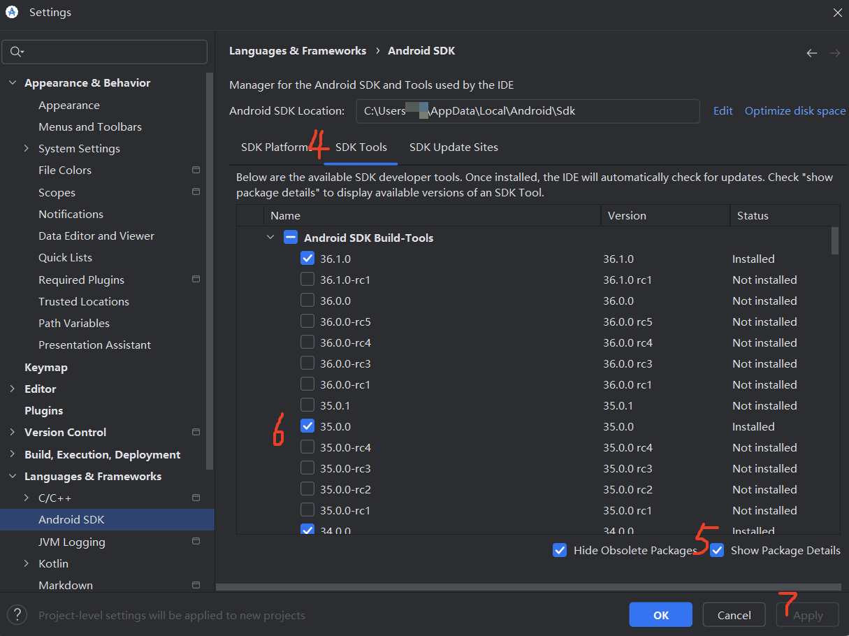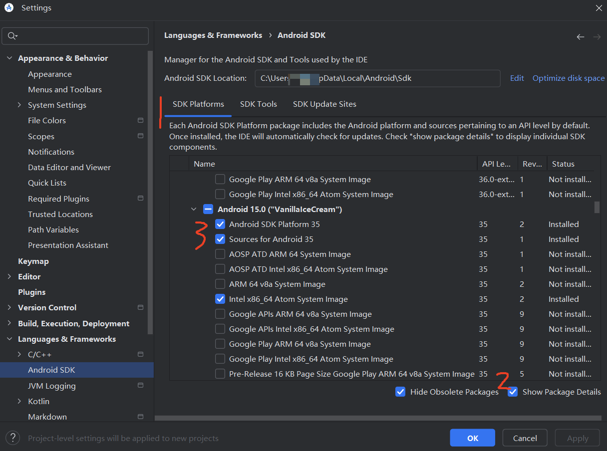 确保勾选了"Android SDK Platform 35"、"Intel x86 Atom_64 System Image"、"35.0.0"