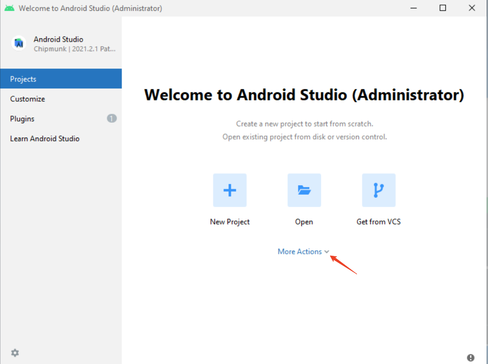 Android Studio默认会安装最新版Android SDK,但目前编译React Native需要的是15版本的SDK。完成本文章的步骤4之后,会有一个欢迎界面,在欢迎界面点击"More Actions",再点击"SDK Manager"。