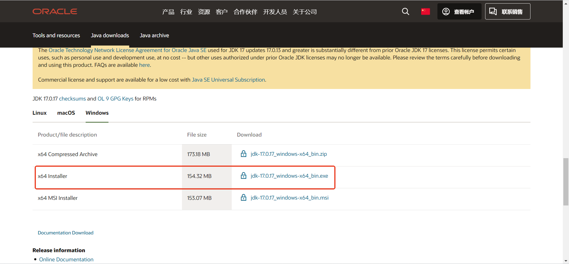 JDK下载地址参考:https://www.oracle.com/cn/java/technologies/downloads/#java17-windows