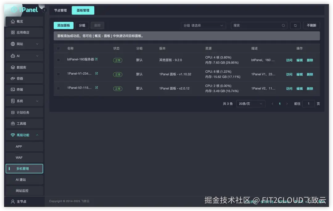 通过这一功能,用户可以在一个控制台中查看并快速跳转至不同服务器的管理界面,省去了频繁登录切换的操作。这一新增功能不仅提升了多服务器运维管理的效率,也为未来的多面板协同管理能力奠定了基础。