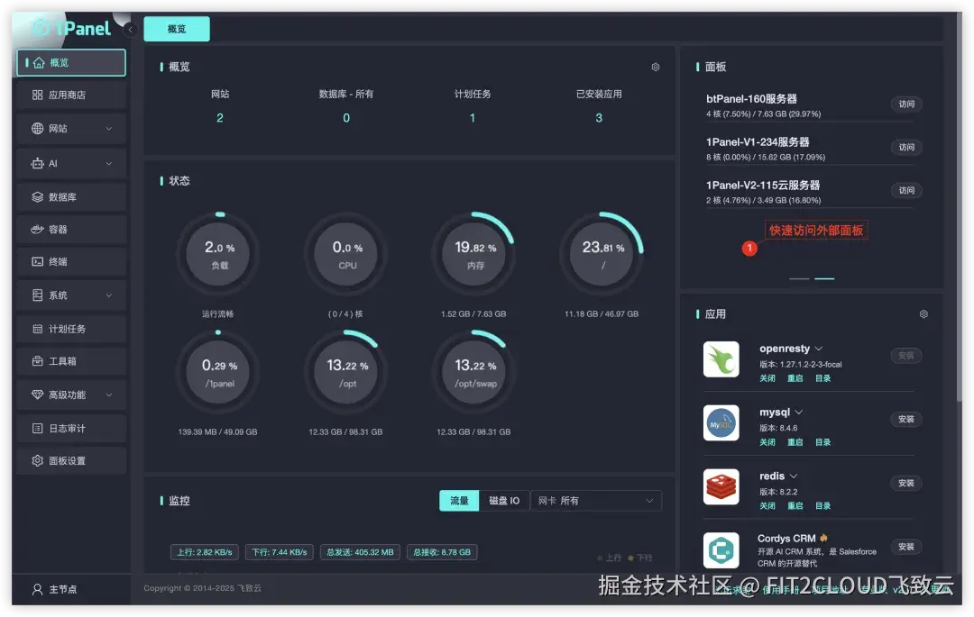 ▲图2 在1Panel"概览"页面快速访问外部面板(X-Pack)