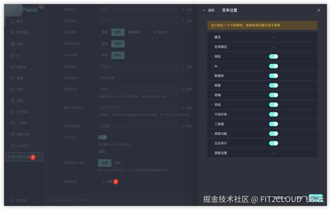 1Panel v2.0.12版本在"面板设置"模块新增水印配置功能,支持为1Panel自身界面添加个性化水印。