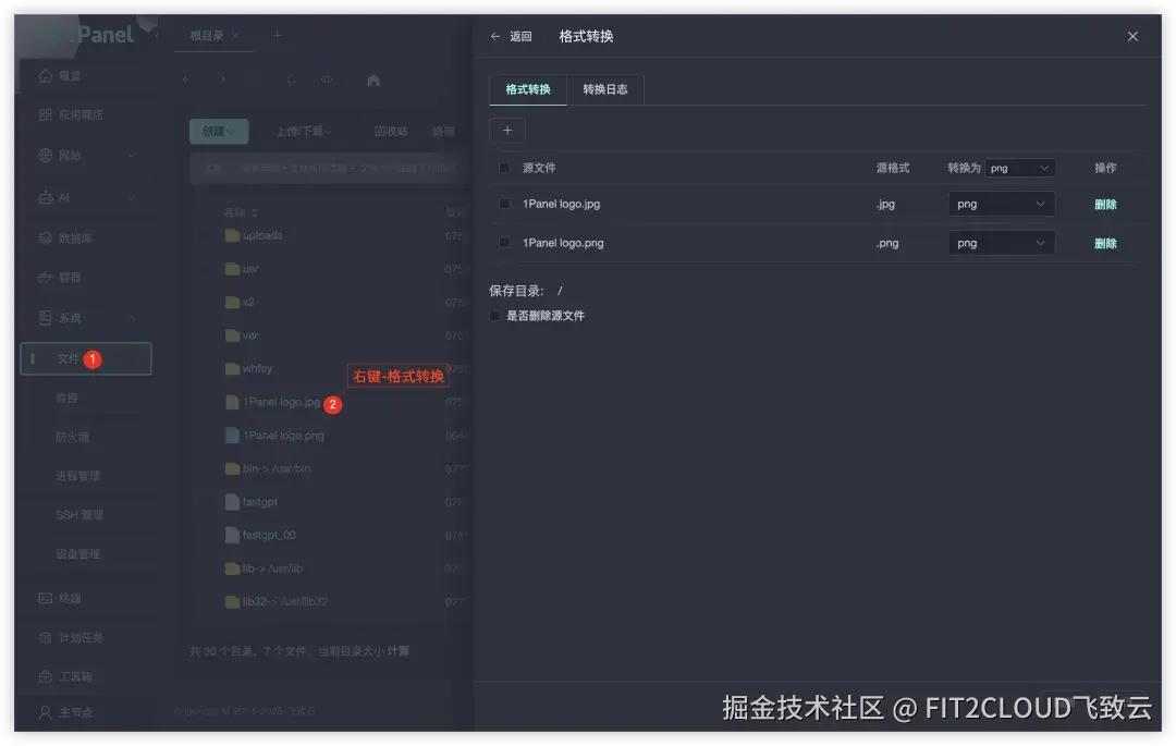 无论是将PNG格式转换为JPG、WebP格式,还是对视频进行MP4、AVI、MOV等格式的快速转换,都可以直接在面板内完成,无需额外安装第三方工具。这一功能极大地提升了1Panel用户处理多媒体文件的便捷性,让1Panel不仅是服务器管理平台,也是轻量高效的内容处理中心。