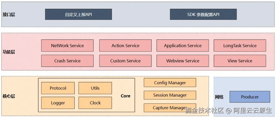 - 功能层:数据采集,具体包含网络、交互、应用、卡顿、崩溃、自定义、Webview、页面、应用等模块。