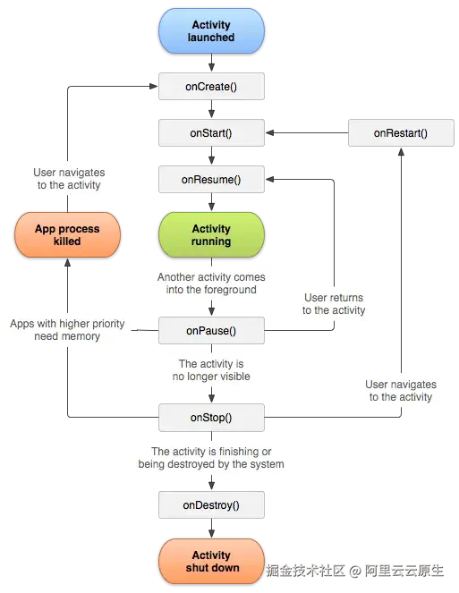 Android API: Android 框架层提供的生命周期回调机制,实现对页面、用户行为和应用启动等事件的监控。以 Activity 为例,它是 Android 应用中用户界面的基本单元,生命周期由一系列回调方法管理,清晰地定义了其从创建到销毁的各个状态。关键的生命周期状态包括: