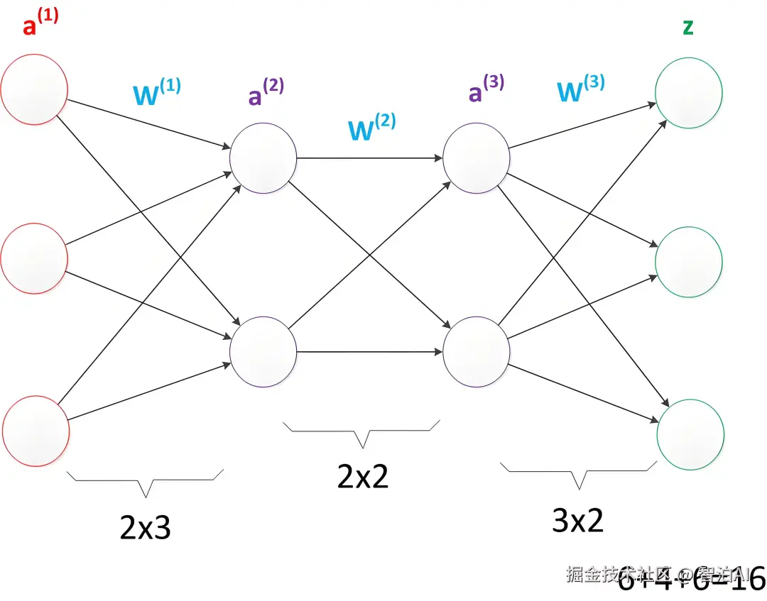 下图中可以看出 W(1) 中有 6 个参数,W(2) 中有 4 个参数,W(3) 中有 6 个参数,所以整个神经网络中的参数有 16 个(这里暂不考虑偏置节点,下同)。