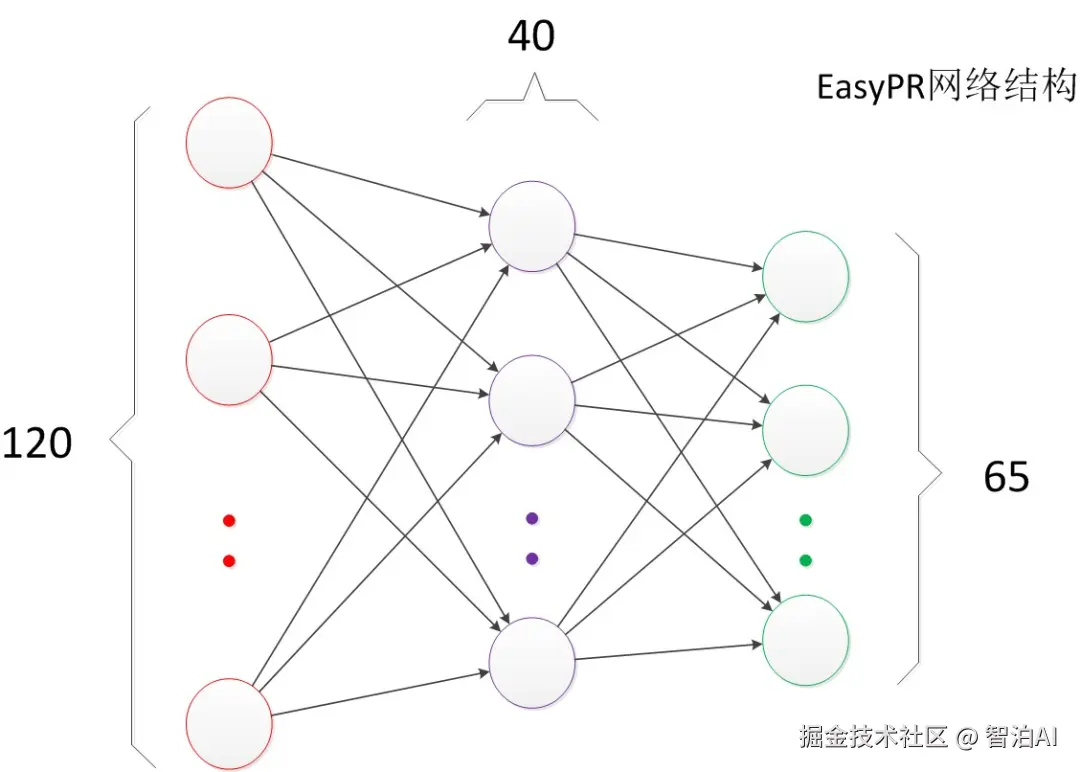 EasyPR 使用了字符的图像去进行字符文字的识别。输入是 120 维的向量。输出是要预测的文字类别,共有 65 类。