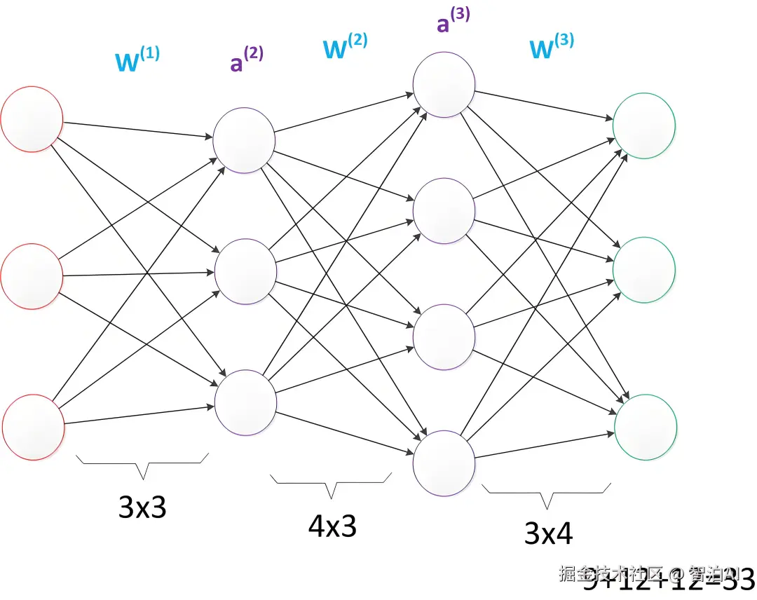 假设我们将中间层的节点数做一下调整。例如:第一个中间层改为 3 个单元,第二个中间层改为 4 个单元。经过调整以后,整个网络的参数变成了 33 个。