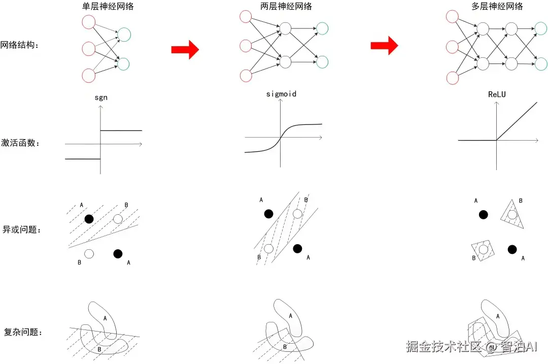 从单层神经网络到双层结构,进而扩展到多层网络架构,下图直观展示了:随着网络深度的提升,结合激活函数的优化,神经网络对决策边界拟合能力的演变。