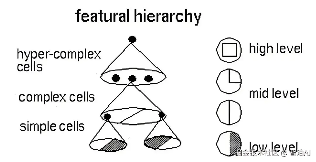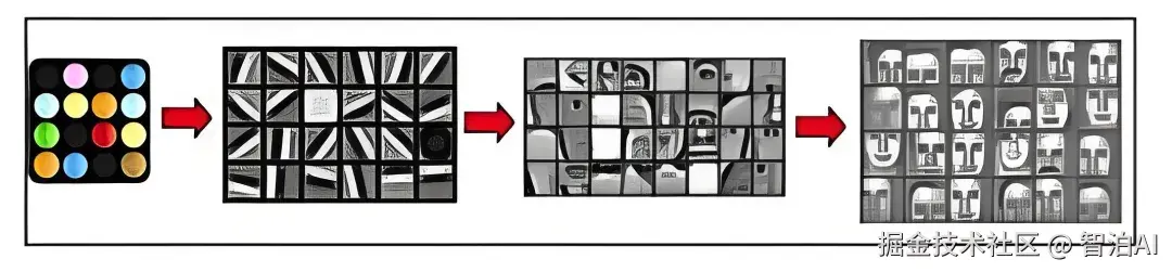 以人脸识别为例,下图展示了 AI 识别人脸的过程:边缘特种 => 局部特征或基本形状 => 人脸。