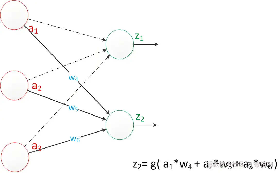 可以看到,z2 的计算中除了三个新的权值:w4,w5,w6 以外,其他与 z1 是一样的。