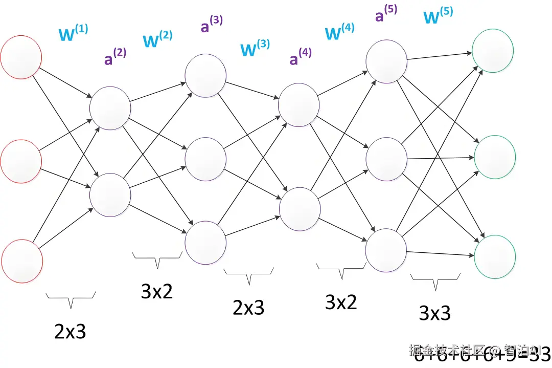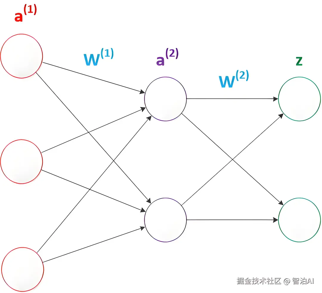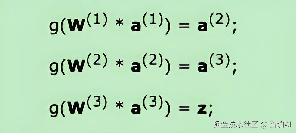 多层神经网络的公式推导也与两层神经网络类似,使用矩阵运算。例如:在已知输入 a(1),参数 W(1),W(2),W(3)的情况下,输出 z 的推导公式如下: