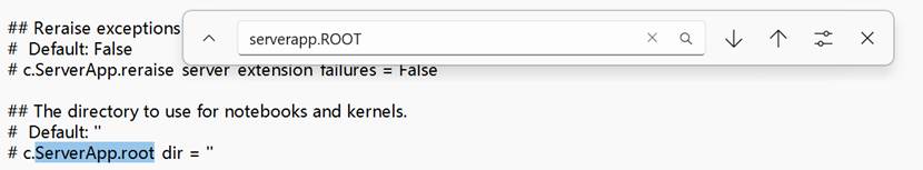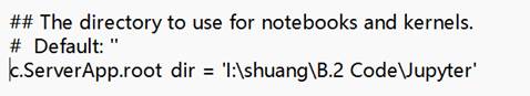 使用notepad++打开;直接 Ctrl+F 搜索关键字 directory to usefor notebooks and kernels,就可以找到目标代码行了,这里有些博主给的是搜索:"c.NotebookApp.notebook_dir",但貌似并不是所有版本都是这个,但是前面的注释是一样的directory to usefor notebooks and kernels!所以可以搜索这个关键词。
