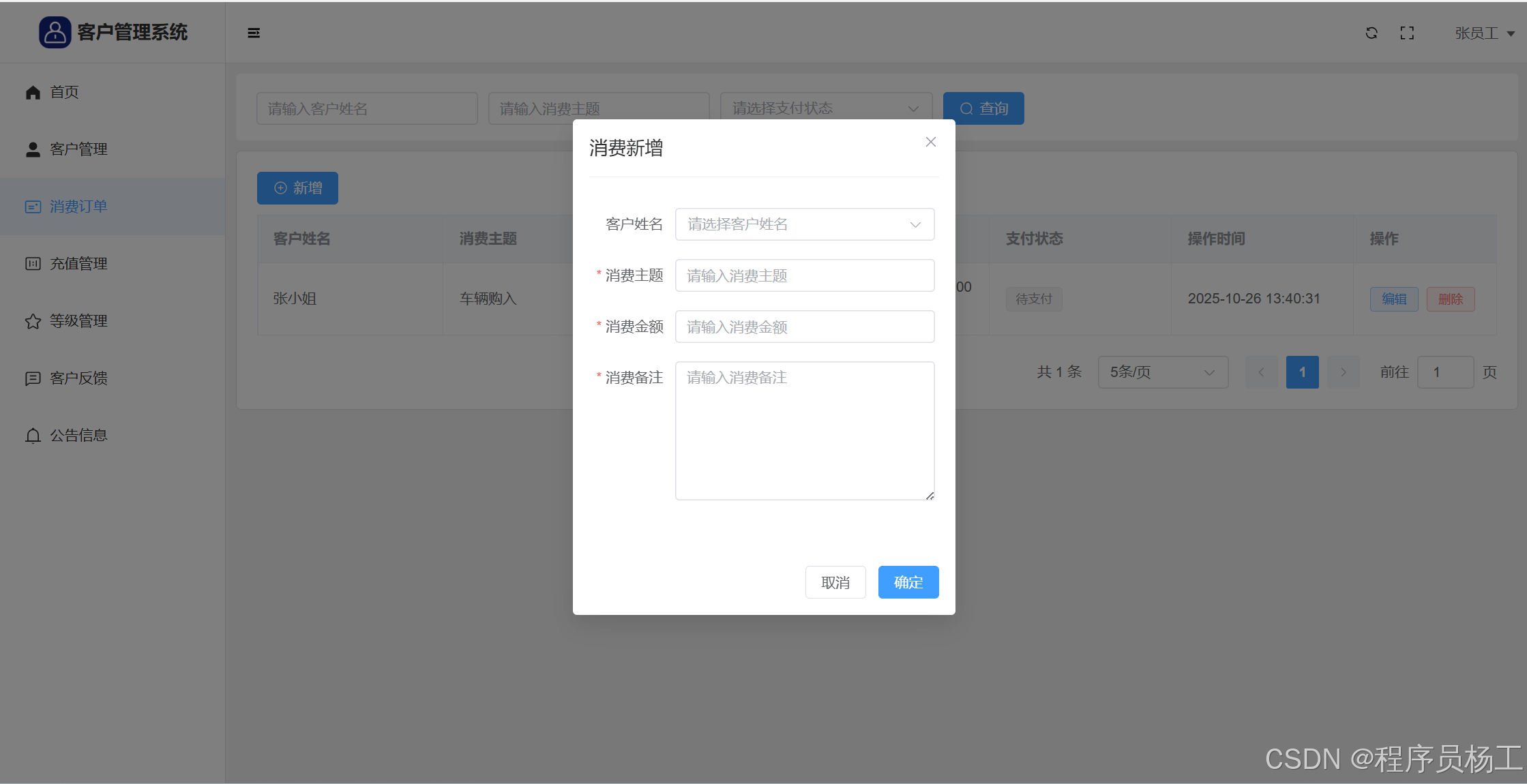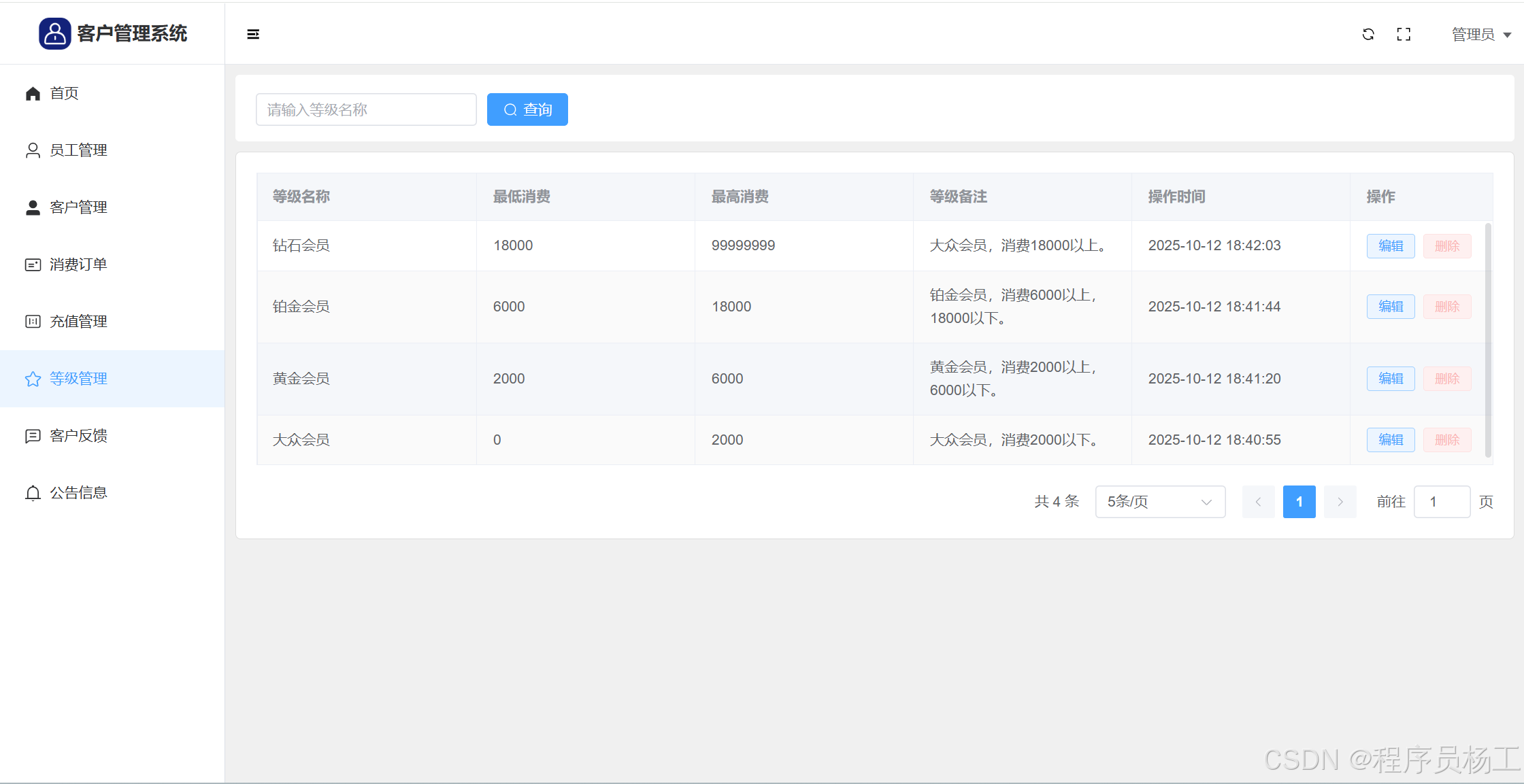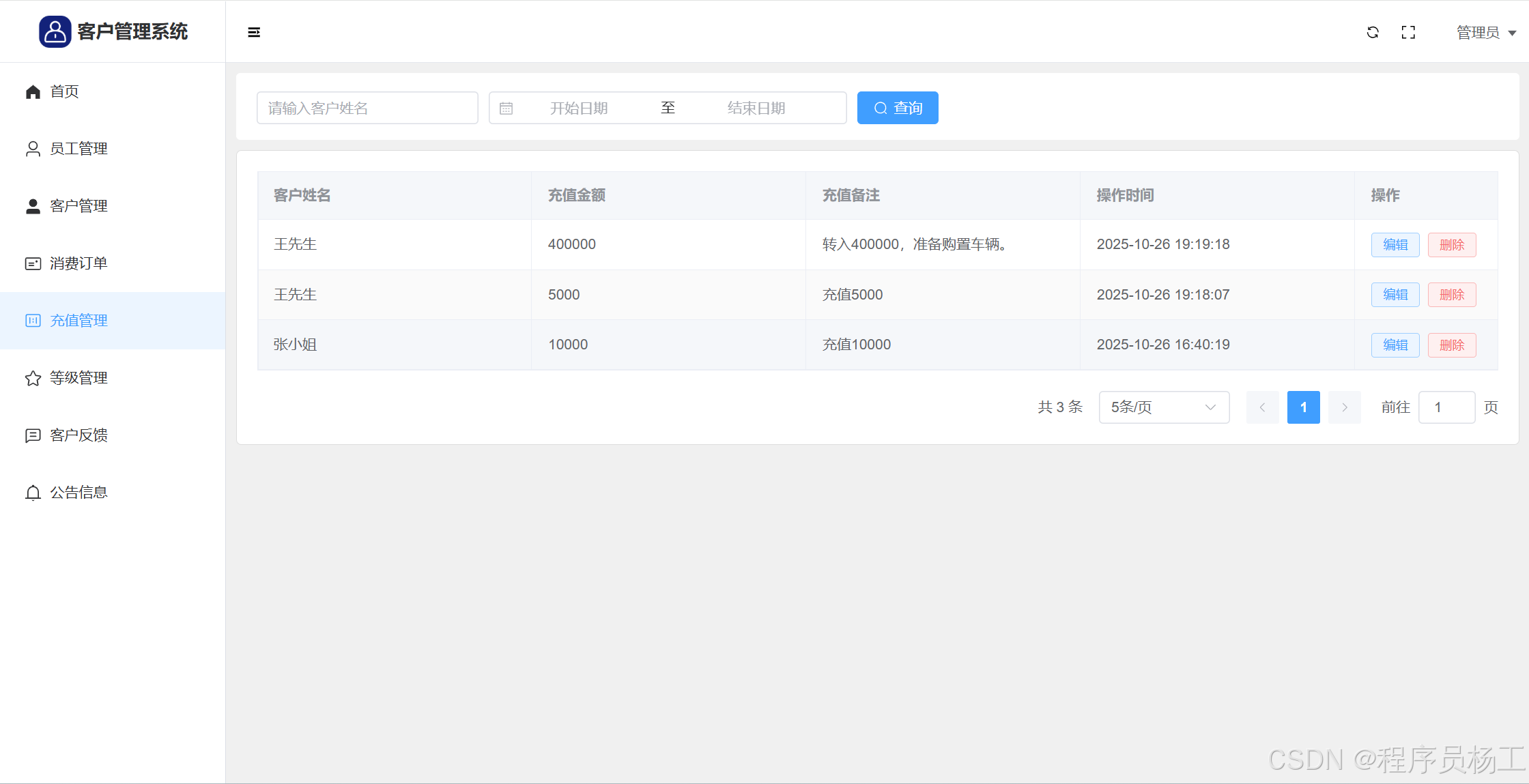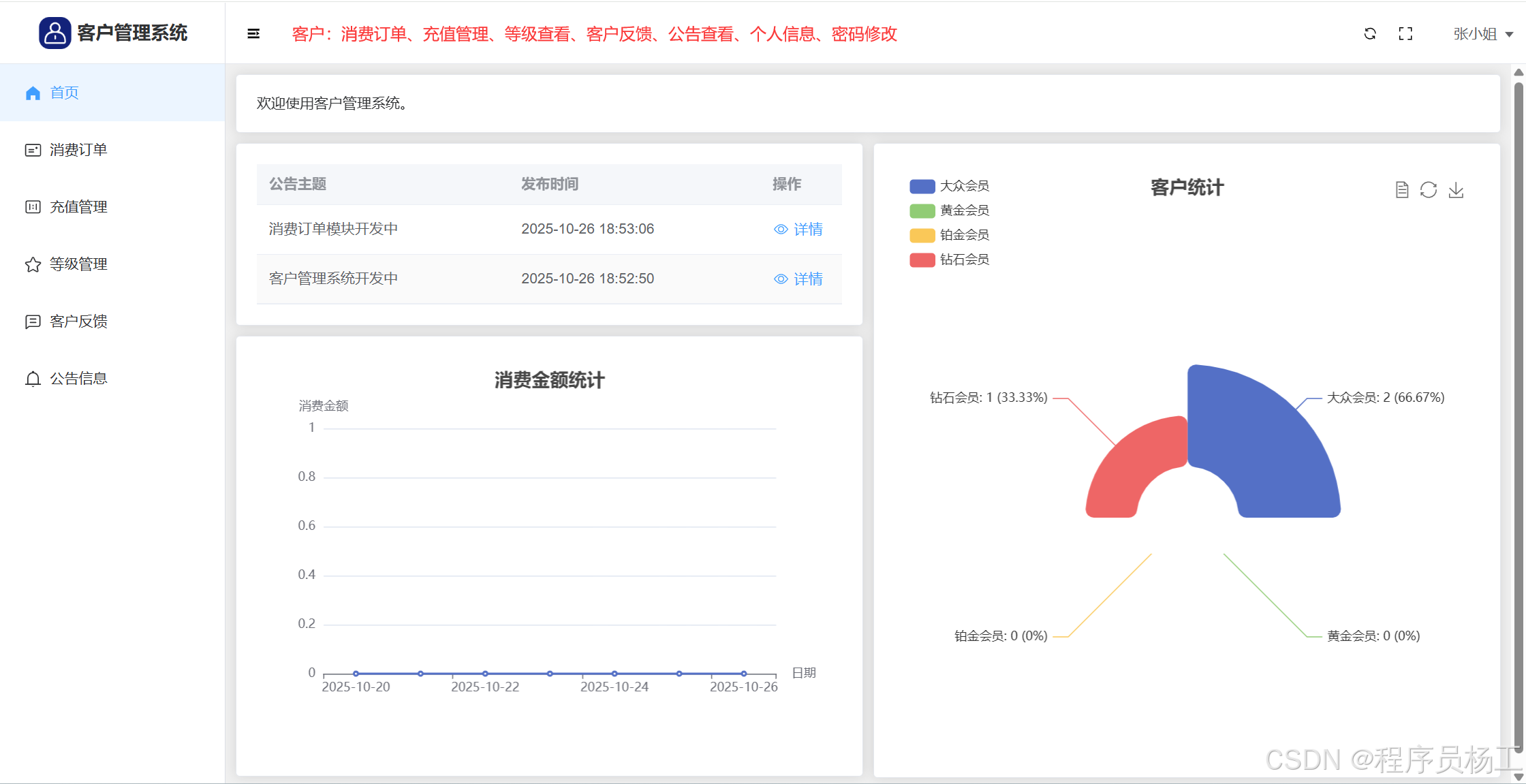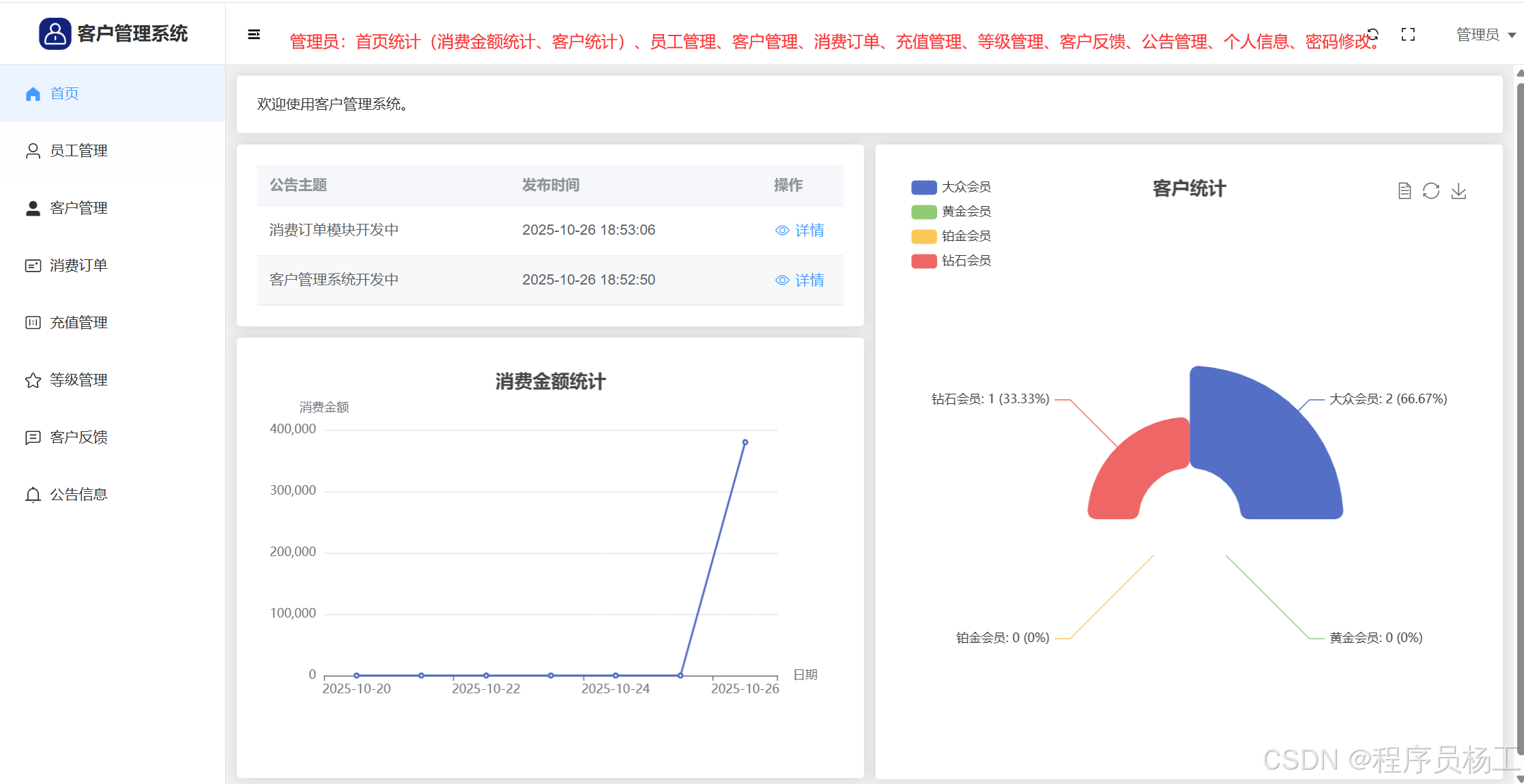 基于SpringBoot3+Vue3前后端分离的客户信息管理系统,系统包含管理员、员工、客户角色,功能如下:管理员:首页统计(消费金额统计、客户统计)、员工管理、客户管理、消费订单、充值管理、等级管理、客户反馈、公告管理、个人信息、密码修改。员工:客户管理、消费订单、充值管理、等级查看、客户反馈、个人信息、密码修改。客户:消费订单、充值管理、等级查看、客户反馈、公告查看、个人信息、密码修改。界面设计如下: