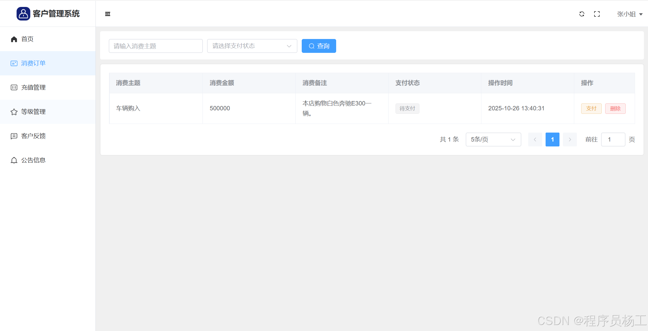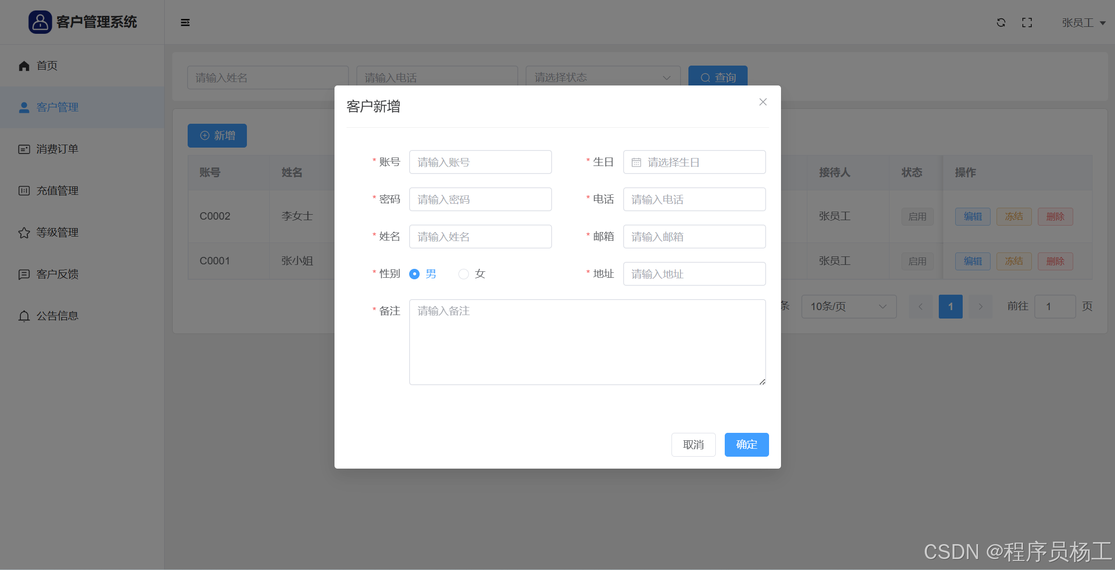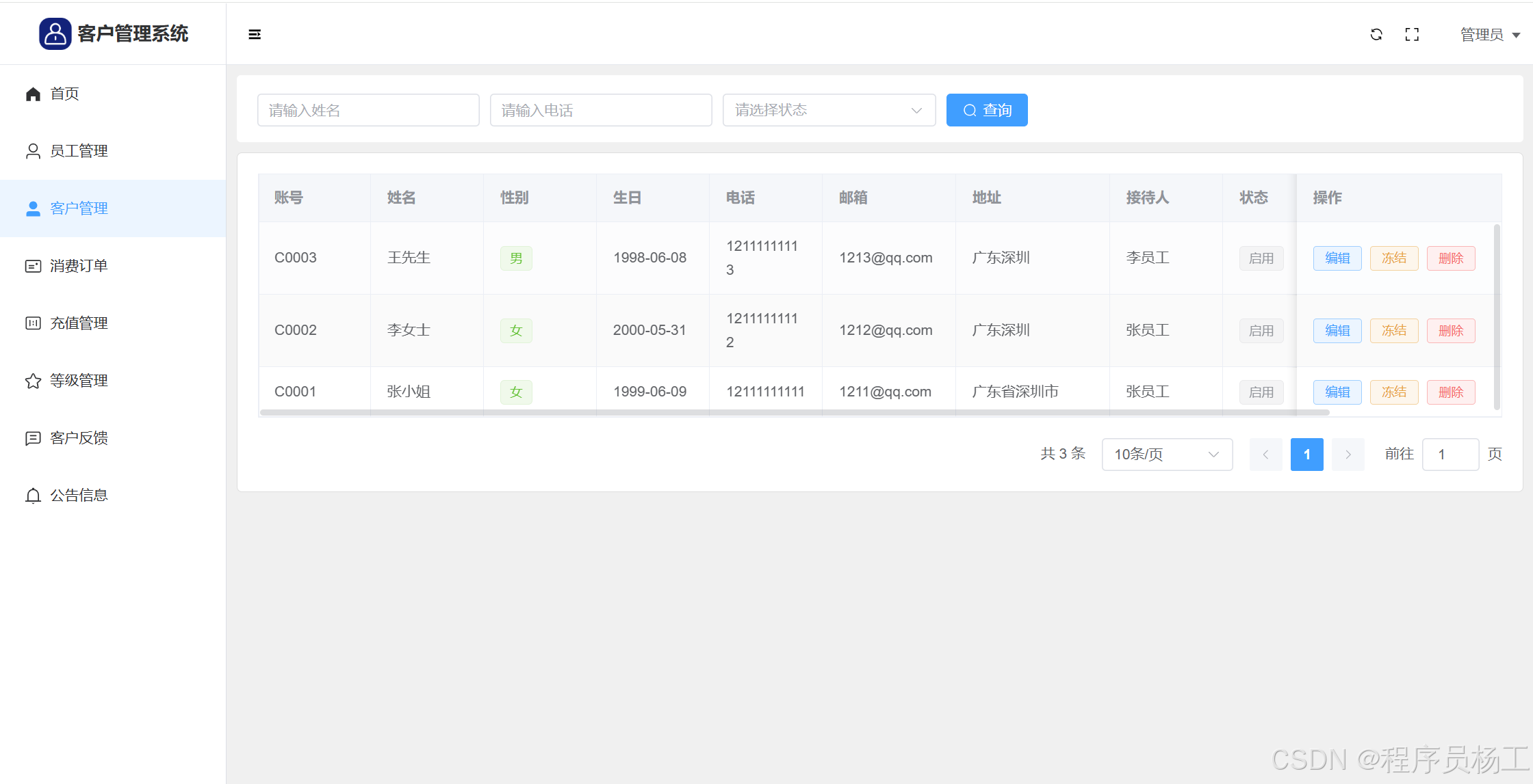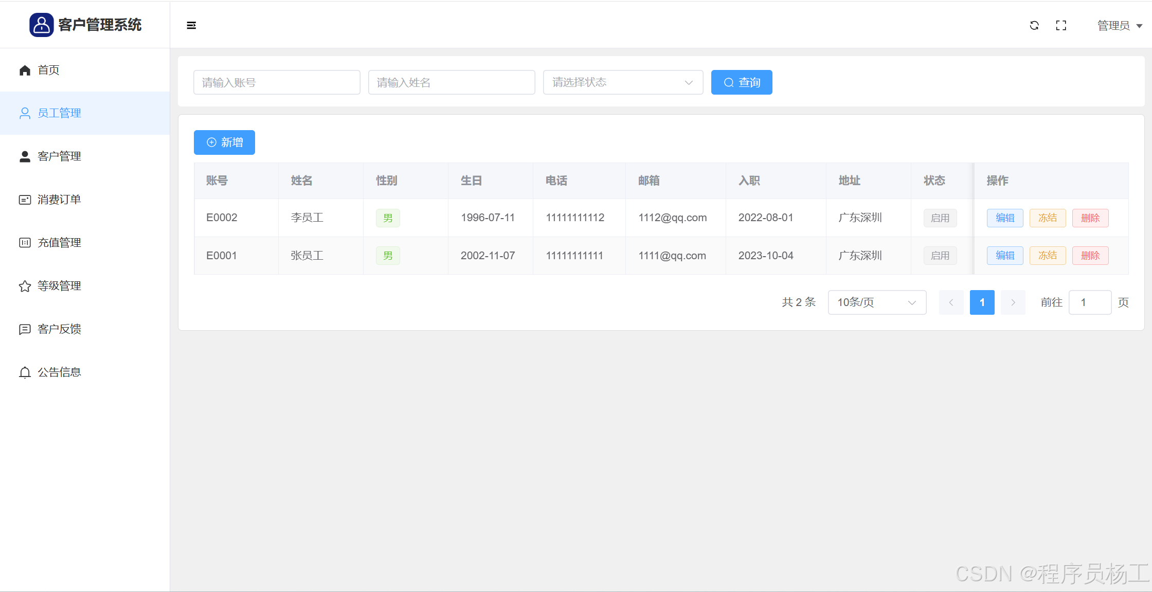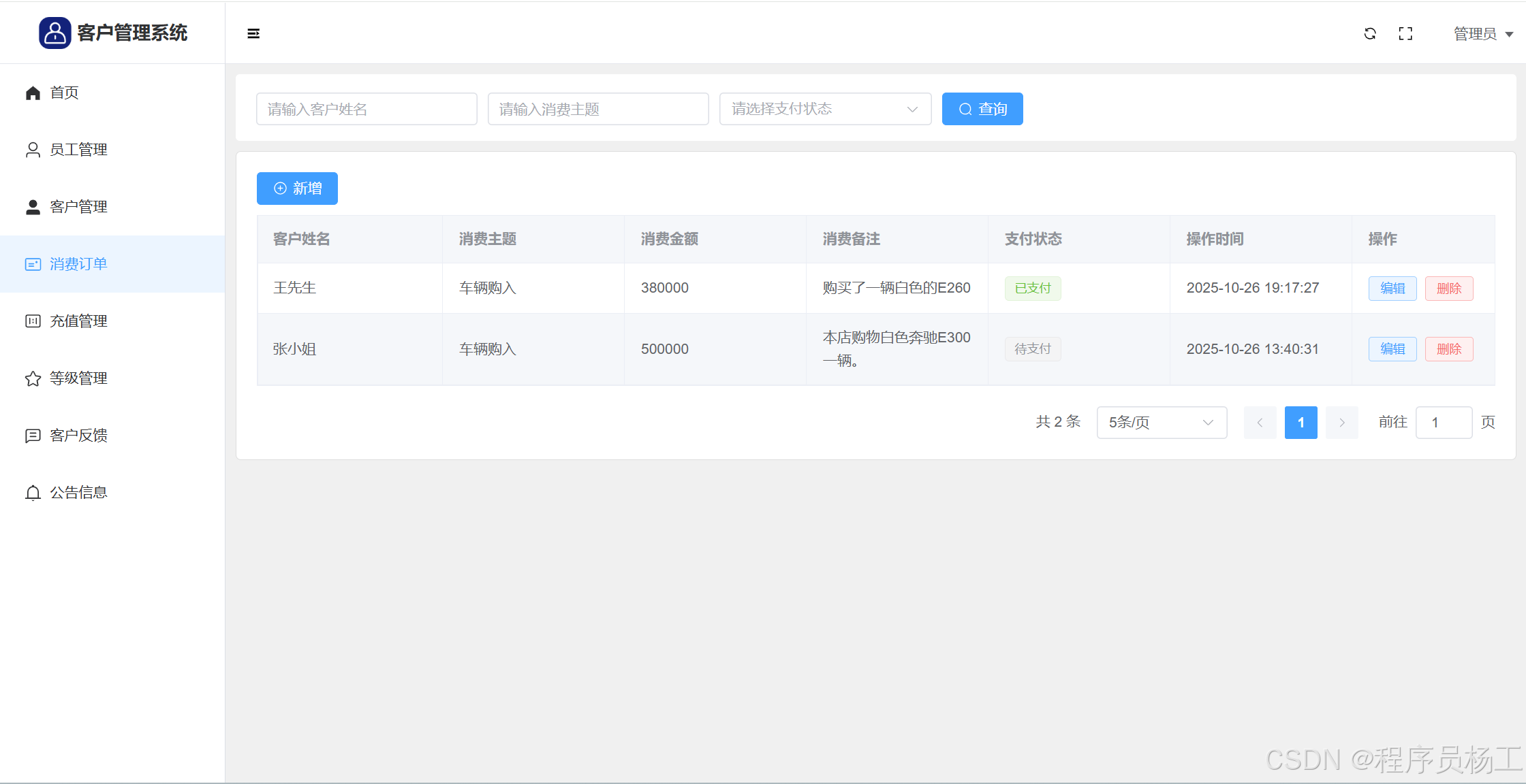 基于SpringBoot3+Vue3前后端分离的客户信息管理系统,系统包含管理员、员工、客户角色,功能如下:管理员:首页统计(消费金额统计、客户统计)、员工管理、客户管理、消费订单、充值管理、等级管理、客户反馈、公告管理、个人信息、密码修改。员工:客户管理、消费订单、充值管理、等级查看、客户反馈、个人信息、密码修改。客户:消费订单、充值管理、等级查看、客户反馈、公告查看、个人信息、密码修改。界面设计如下: