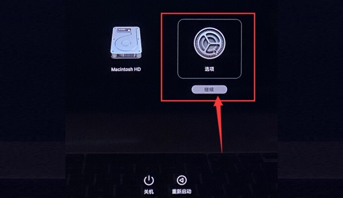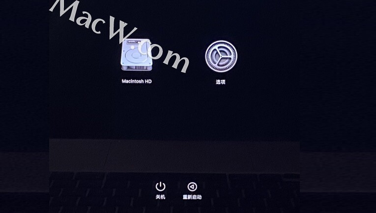 按照提示,先选择关机。按住触控ID或电源按钮,至少10秒,将出现启动选项窗口。