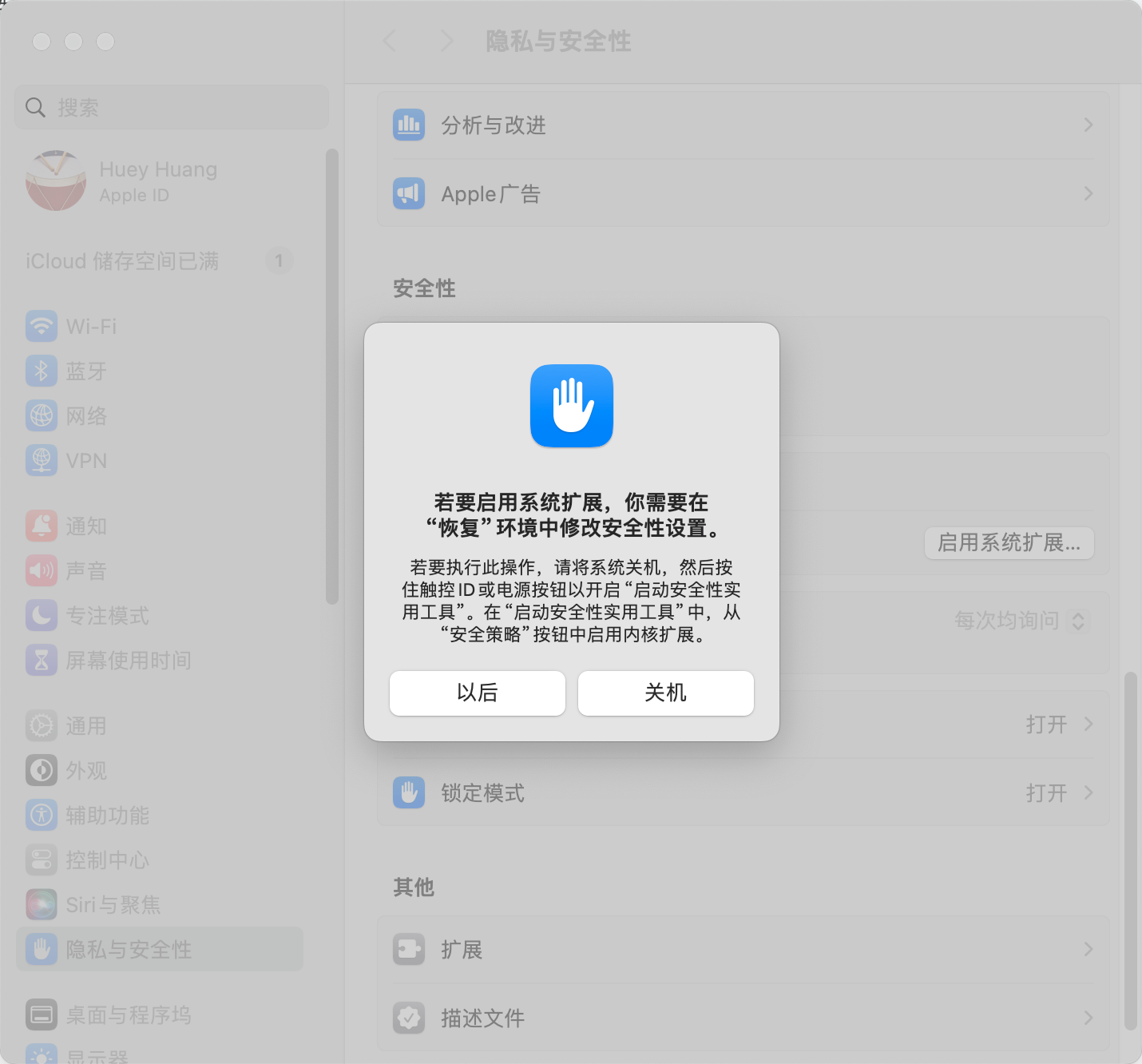 在使用mac电脑时,部分软件需要开启系统扩展才能正常使用。添加系统扩展时,系统提示若要启用系统扩展,您需要在"恢复"环境中修改安全性设置解决方法,如下图所示。