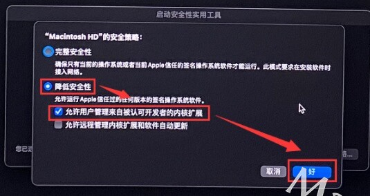 选择[降低安全性],勾选"允许用户管理来自被认可开发者的内核扩展",点击[好]。