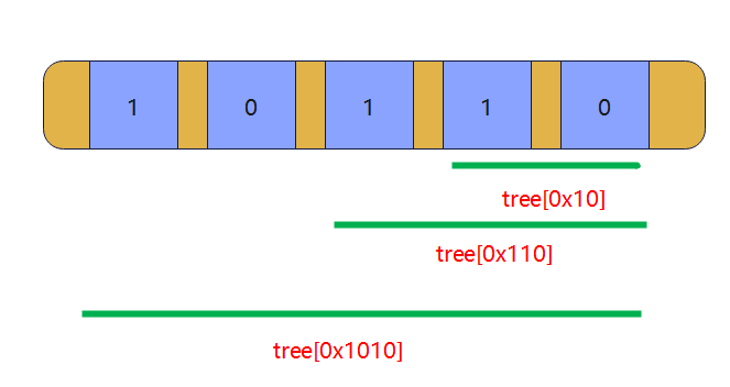 sum(0x10110) = tree[0x10] + tree[0x110] + tr[0x10110]即:sum(22) = tree[2] + tree[6] + tree[22]