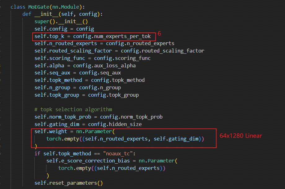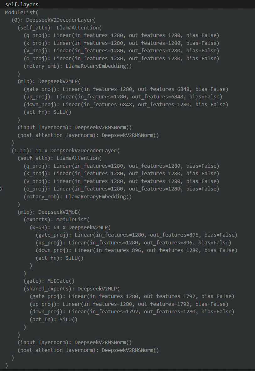 从流程图中可以明显看出,混合专家模块其实主要针对每个block的transformer模块中的计算量最大的Feed Forward(前馈网络,实际就是全连接+act)做选择,64个混合专家在903个输入token中每个token都被选择6个,即计算903x6次专家计算(Feed Forward),但如果是稠密模型则需要做903x64次FeedForward,计算量巨大。同时,在DeepSeek-3B-MoE中存在一个共享专家(Feed Forward)用于均衡信息。共享专家模块的全连接层维度更大,可以参考下面的ModuleList块,存在1280x6848的权重。而每个混合专家只有1280x896的权重,但64个混合专家权重会更多,所以混合专家模块MoE的主要目的是以空间换时间,更大内存的占用换取推理时更快的速度。