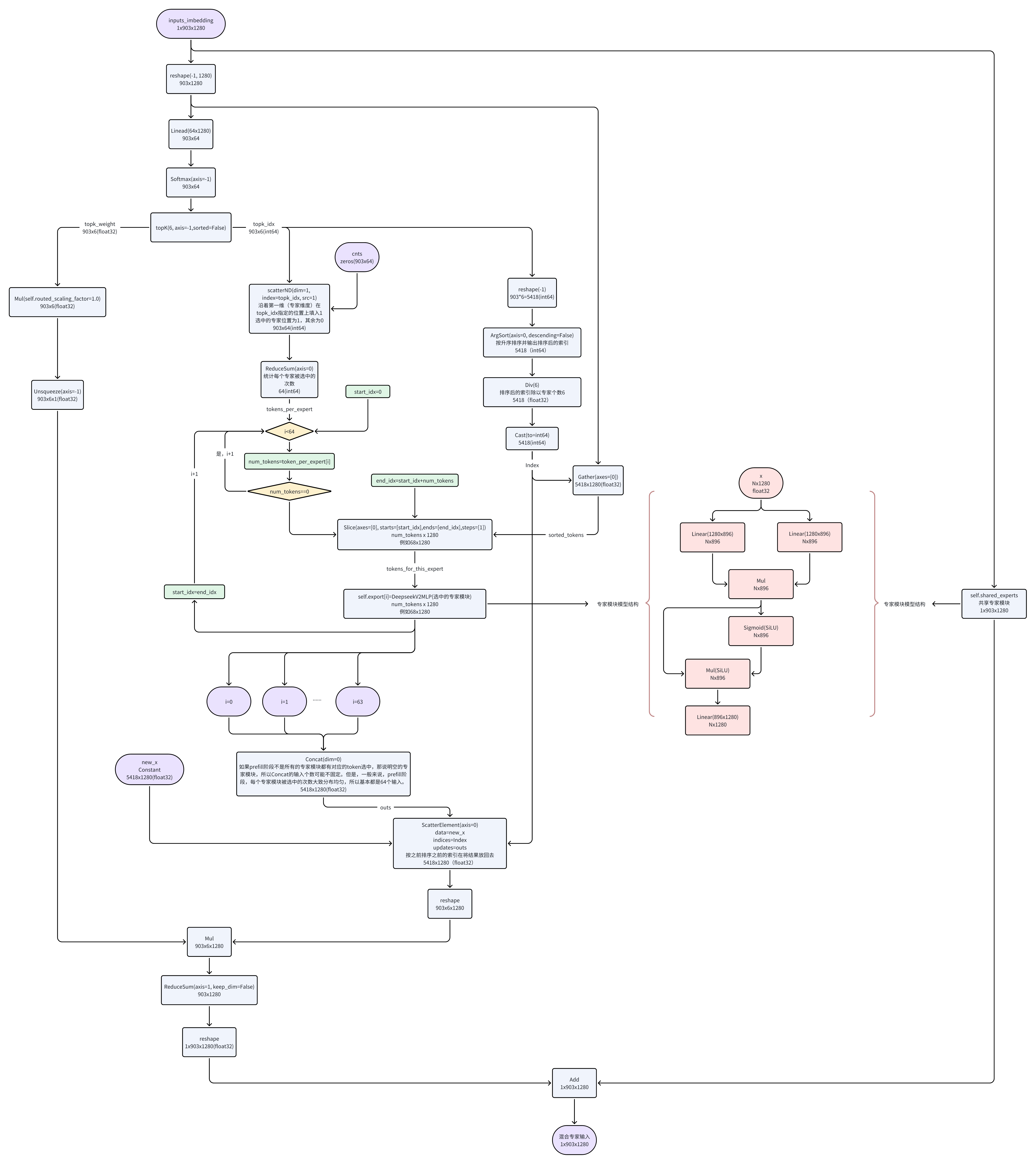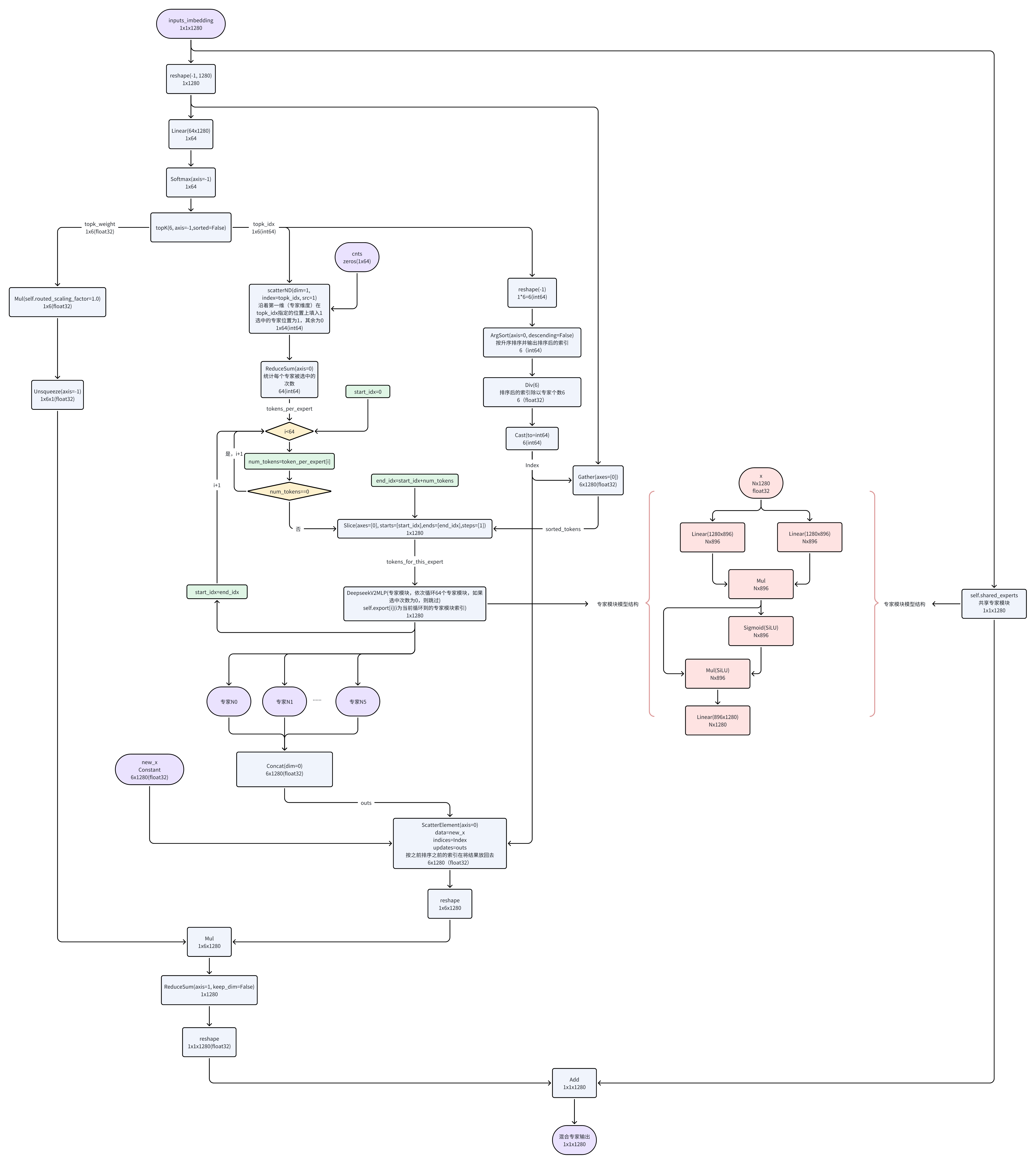 与prefill阶段类似,只不过prefill阶段903个token,在decode阶段每次只有一个token输入,即1x1x1280。另外,由于decode阶段每次输入一个token,所以混合专家每次只有6个被选中激活,即concat的输入个数固定为6个。