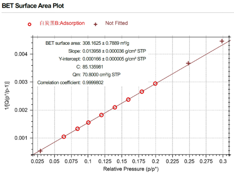 以下是采用国仪量子Climber60比表面积及孔径分析仪对两种白炭黑(A和B)样品的表征案例。测试前,两种白炭黑样品均在160℃真空条件下加热120分钟进行充分的脱气处理。对于介孔材料的BET计算时,P/P0选点范围为0.05-0.3(GB/T 10722-2014规定白炭黑选点范围为0.05-0.2)。从图1和图2的BET方程拟合曲线可得到白炭黑A和白炭黑B的比表面积分别为:209.81 m2/g和308.16 m2/g,白炭黑 B 的比表面积优势明显,意味着其单位质量的表面活性位点更多,在吸附、催化、补强等应用场景中,可能表现出更优的性能。