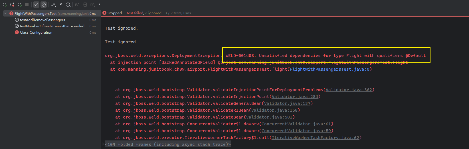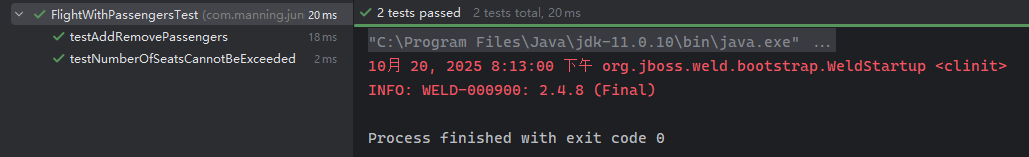 上述代码中,相关组件的打包通过 @Deployment 注解的方法完成,具体由 ShrinkWrap 相关 API 实现。最初没有 FlightProducer.class 这个类(L7),但由于首次运行时 Arquillian 无法顺利注入 Flight 实例(仅支持无参构造函数):