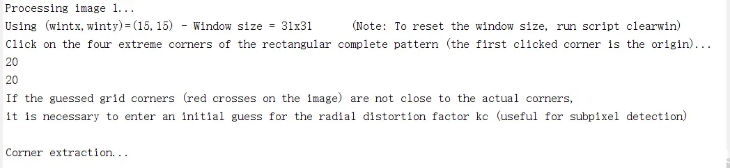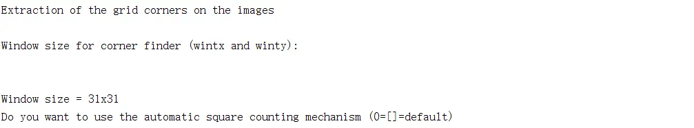 然后通过直接输入"Enter"来选择默认的角点寻找窗口尺寸:wintx=winty=15。这就产生了一个15X15个像素有效的窗口尺寸。