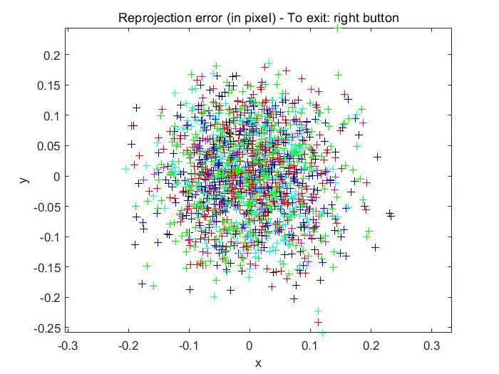 (9)单击standard模式界面上的"Reproject on images "来将网格角点映射到原始图像中。这些映射是基于当前的内参和外参计算出来的。输入一个空字符(直接按"Enter")作为"Number(s) of image(s) to show([]=all images)"来表示你想查看所有图像,下面的图像显示了所有检测到的角点的图像(叉)以及映射的网格角点(圆)。
