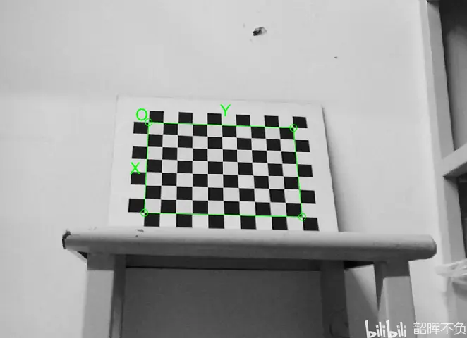 点击的顺序规则:第一个点被用来作为棋盘格坐标系的原点,如下图中的O所示点。其他三个点可以以任何顺序点击。第一个点击的的点非常重要,尤其是对于多相机的情况(例如当计算几个相机在空间之间的相互关系的时候)。当处理多相机系统时对于不同的相机标定图像需要总是选择同一个棋盘格坐标系。经过上面的步骤之后,标定棋盘的边界就显示出来了。