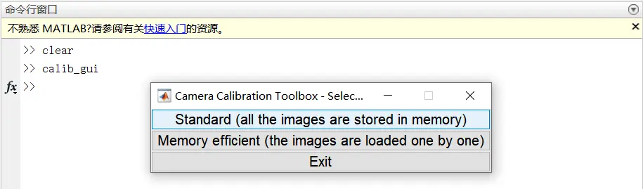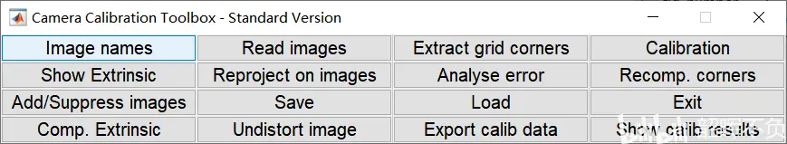 (3)回到MATLAB界面,输入命令,calib_gui,回车,选择standard(all the images are stored in memory),出现如下窗口,如下图所示: