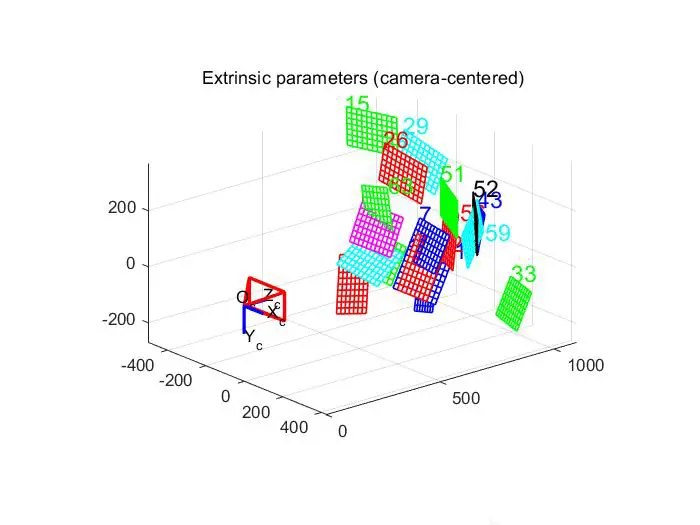 (10)在standard模式界面上单击"Show Extrinsic"。外参(棋盘格相对于相机的相对位置)就以3D的形式显示出来了: