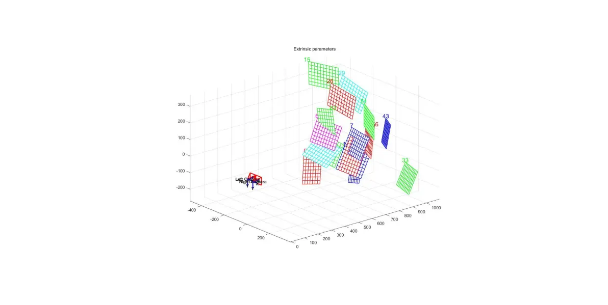 (5)双目相机的空间位置和标定平面可以可视化,通过点击按键"Show Extrinsics of the rig"。