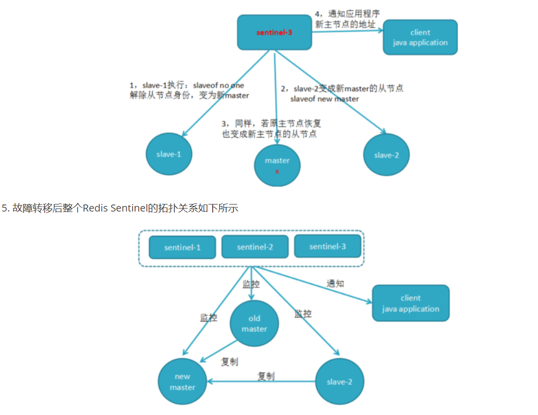 多个Sentinel节点对主节点的故障达成一致,选举出其中一个Sentinel节点作为领导者(leader)负责本次故障转移工作。