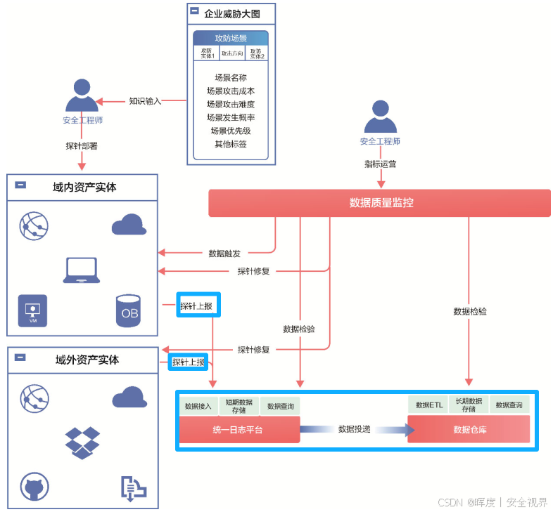 数据的++产生、流转、消费++ 是一个持续的过程,数据链路的质量 直接影响威胁感知能力的有效性。必须建立可靠的监控与修复机制。通过建设观察指标 和巡检机制来保障数据链路的数据质量。