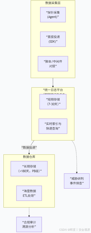 - 统一日志平台: 主要用于实时数据 的接入、短期数据存储 和短时间跨度的索引查询 ;只存储7~30天不等的日志数据,用于威胁研判和事件排查的快速查询
