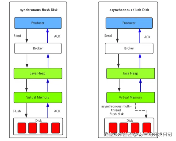 - 2、Broker的刷盘机制:同步刷盘和异步刷盘,不管哪种刷盘都可以保证消息一定存储在pagecache中(内存中),但是同步刷盘更可靠,它是Producer发送消息后等数据持久化到磁盘之后再返回响应给Producer。