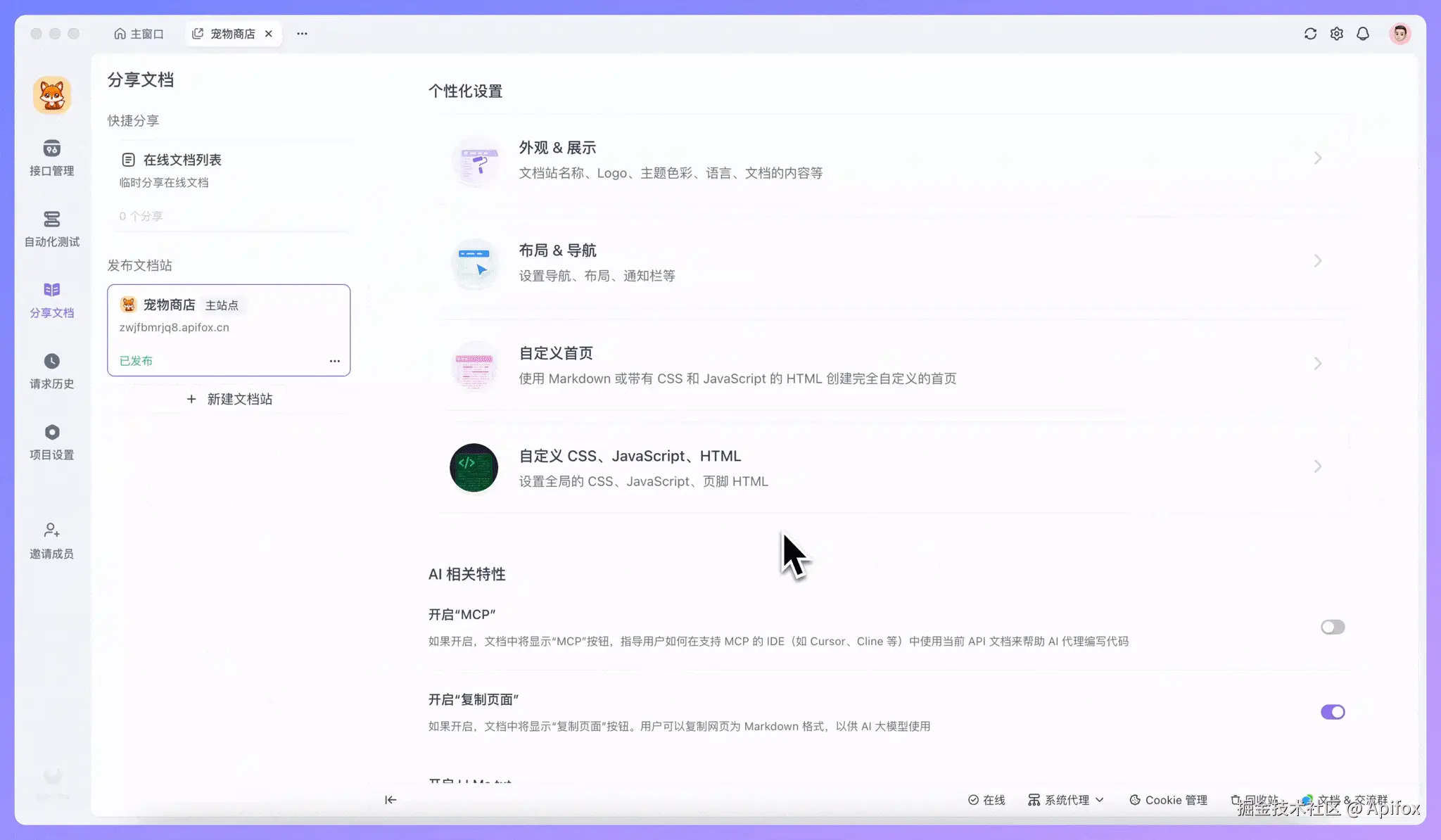 Apifox 优化了在线文档的个性化配置体验,新增实时预览功能。在左侧调整设置项的同时,可以在右侧预览窗口立即看到效果变化,使配置过程更直观清晰,帮助快速找到文档的最佳展示方式。