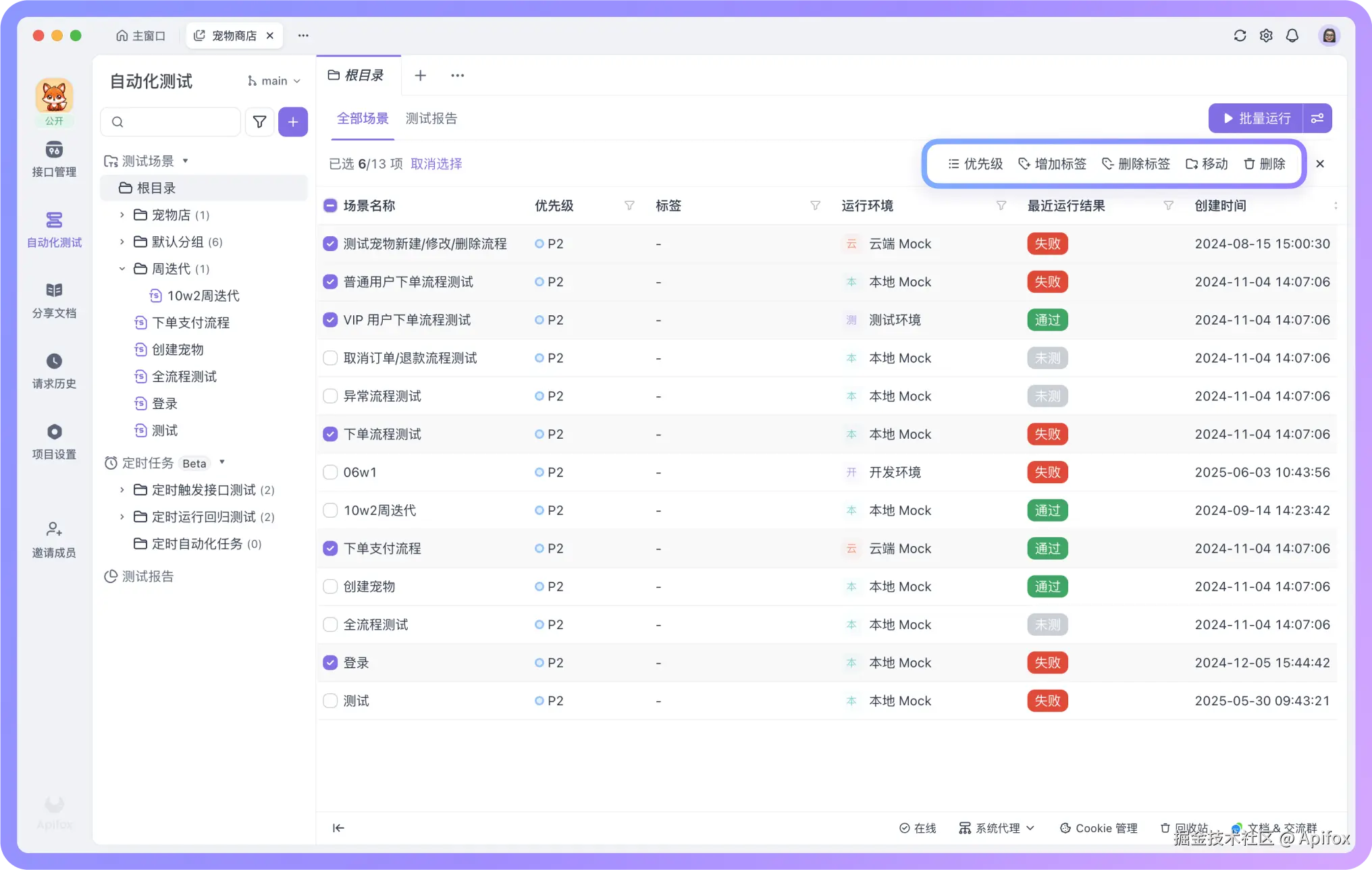 Apifox 新增「测试场景」批量修改功能,支持同时对多个场景进行优先级调整、标签管理、移动或删除等操作,大幅减少重复工作时间,提升测试场景管理效率,使测试场景的维护工作更加高效便捷。