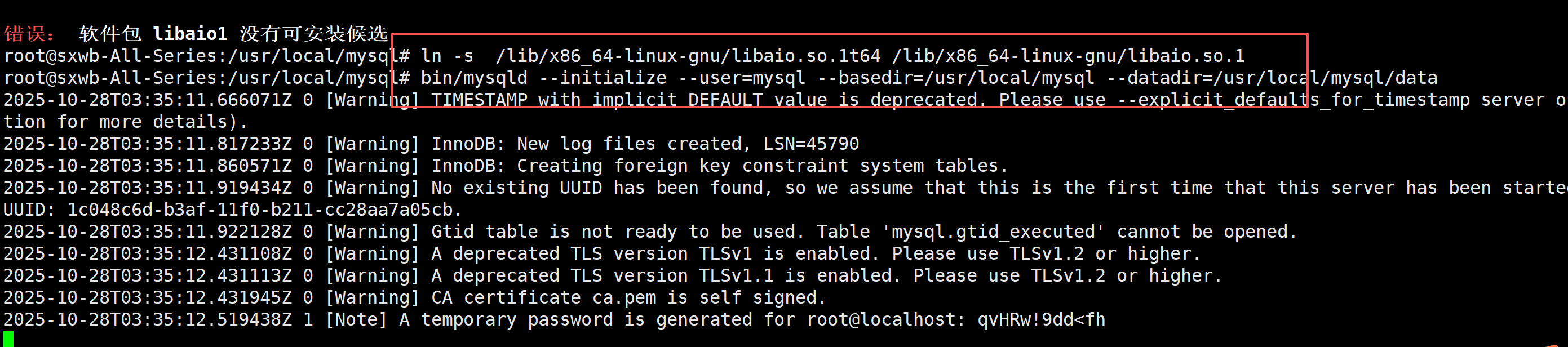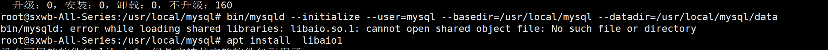 报错;:root@sxwb-All-Series:/usr/local/mysql# bin/mysqld --initialize --user=mysql --basedir=/usr/local/mysql --datadir=/usr/local/mysql/data