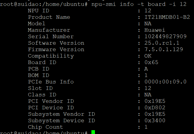root@suidao:/home/ubuntu# | npu-smi 25.0.rc1.1 Version: 25.0.rc1.1 |